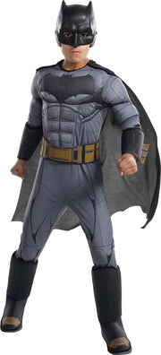 Gear up for action as Gotham City's greatest hero with our Boys DC Comics Deluxe Batman Costume. This costume includes a detailed black and gray jumpsuit with muscle padding and the iconic Batman logo on the chest and attached gauntlets and boot tops. A printed utility belt, flowing black cape, a mask with Batman's signature pointed ears to complete the look. Pair it with accessories like Batman's Batarang or grappling hook for an extra layer of excitement and create a truly unforgettable look.