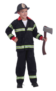 Boys Fireman Costume - Includes black pants with reflective stripes and black shirt with reflective stripes and red collar and cuffs.