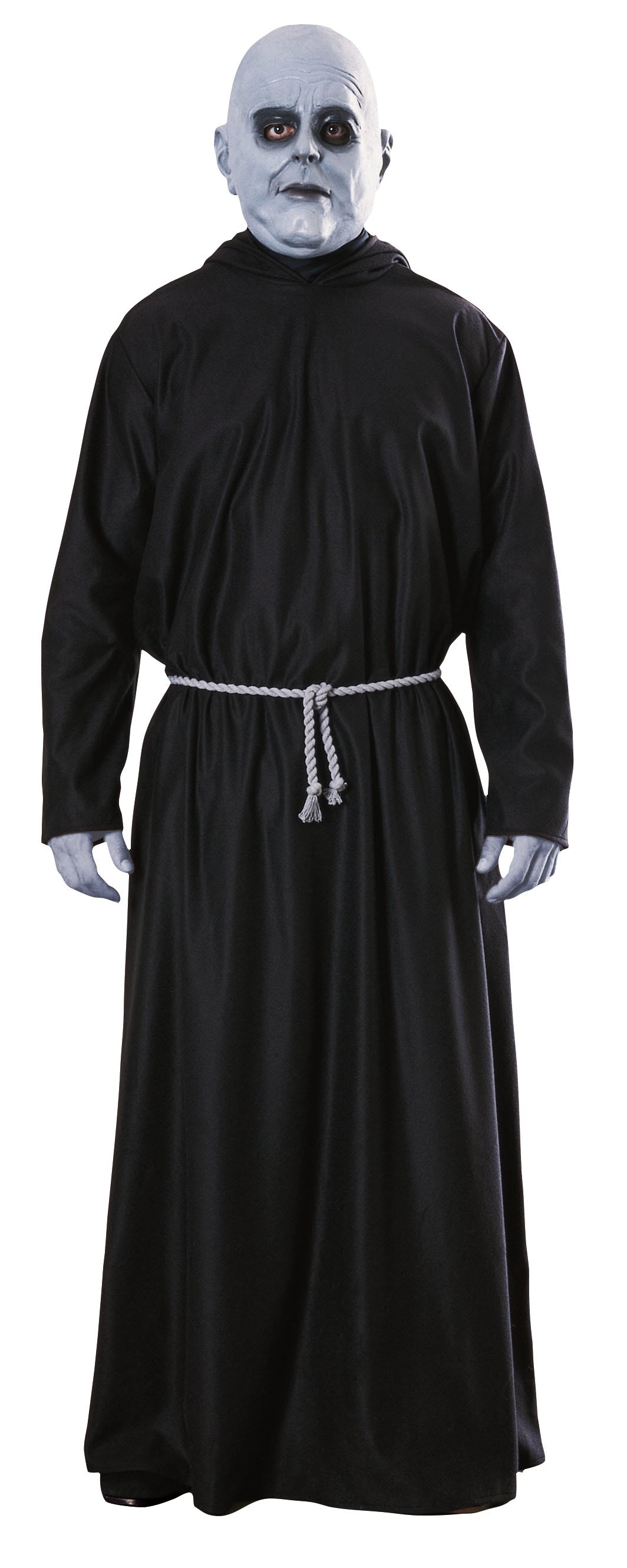 Mens Addams Family Uncle Fester Costume Includes black hooded robe, belt, and mask Officially licensed