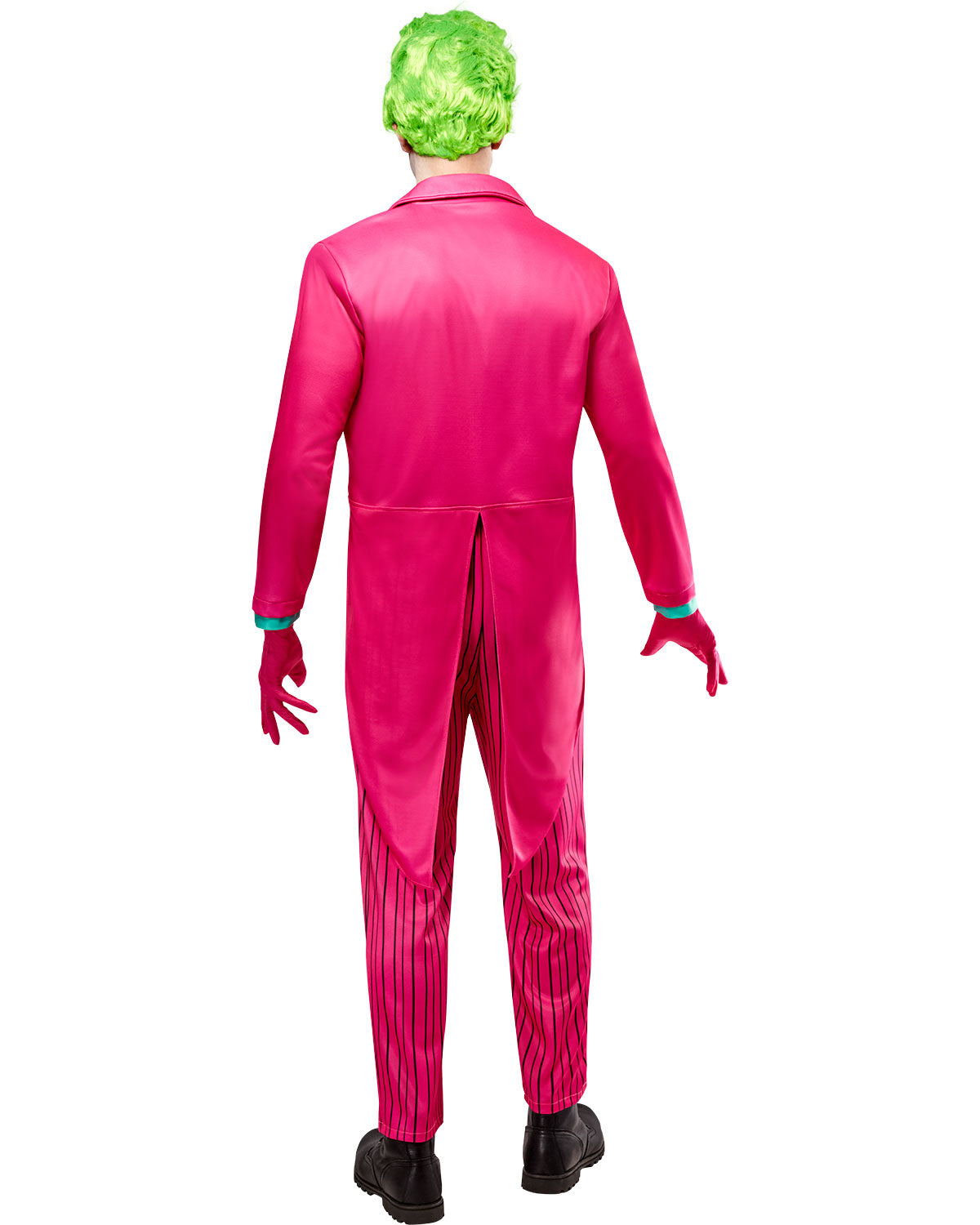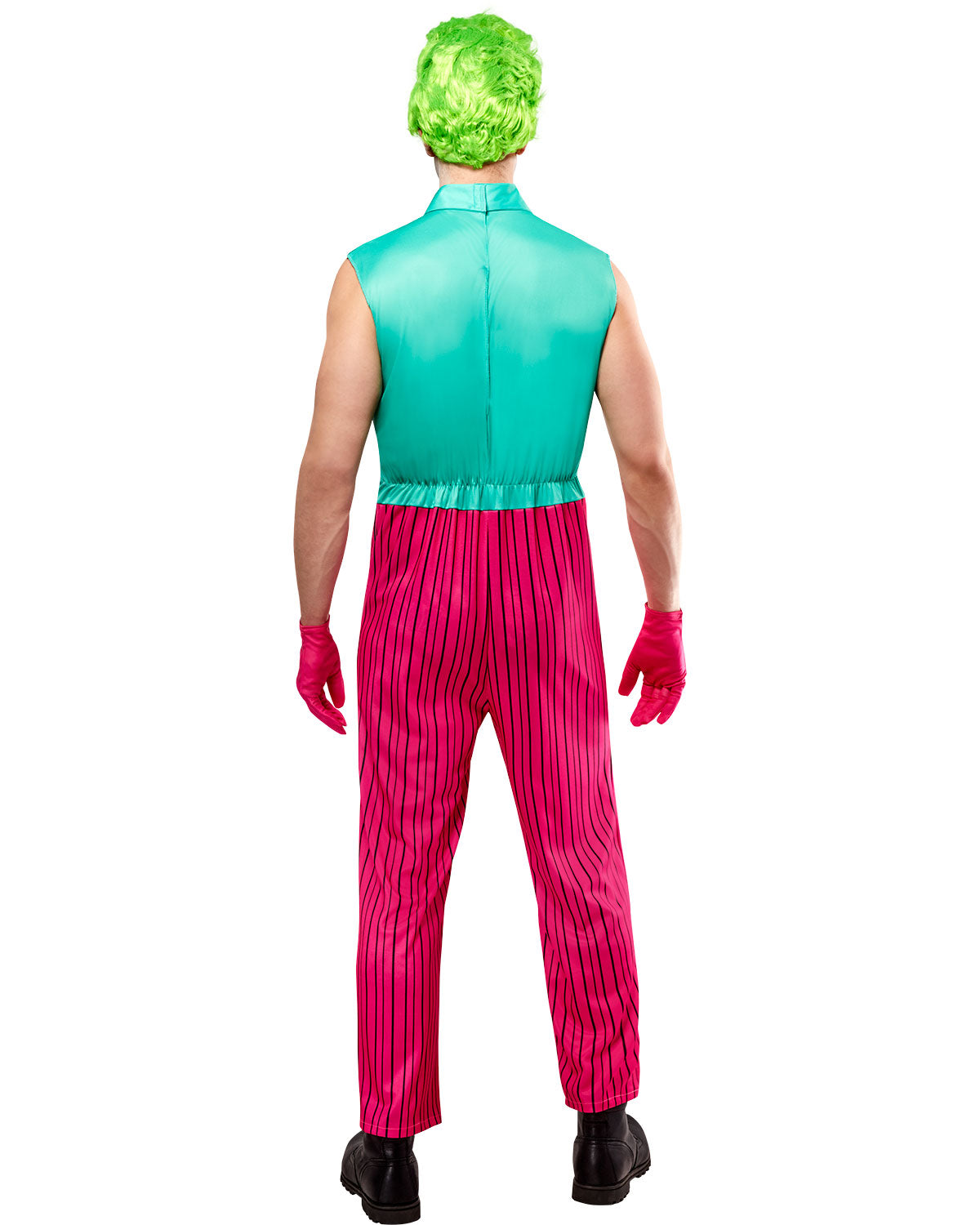 • Includes long-sleeve purple/pink jumpsuit with attached teal/green vest and pin striped pants, matching gloves, and bright green wig